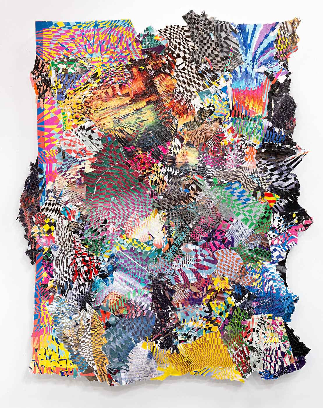 This artwork is composed of sliced and woven street posters collected by the artist from the walls of New York City, Berlin, and Venice.