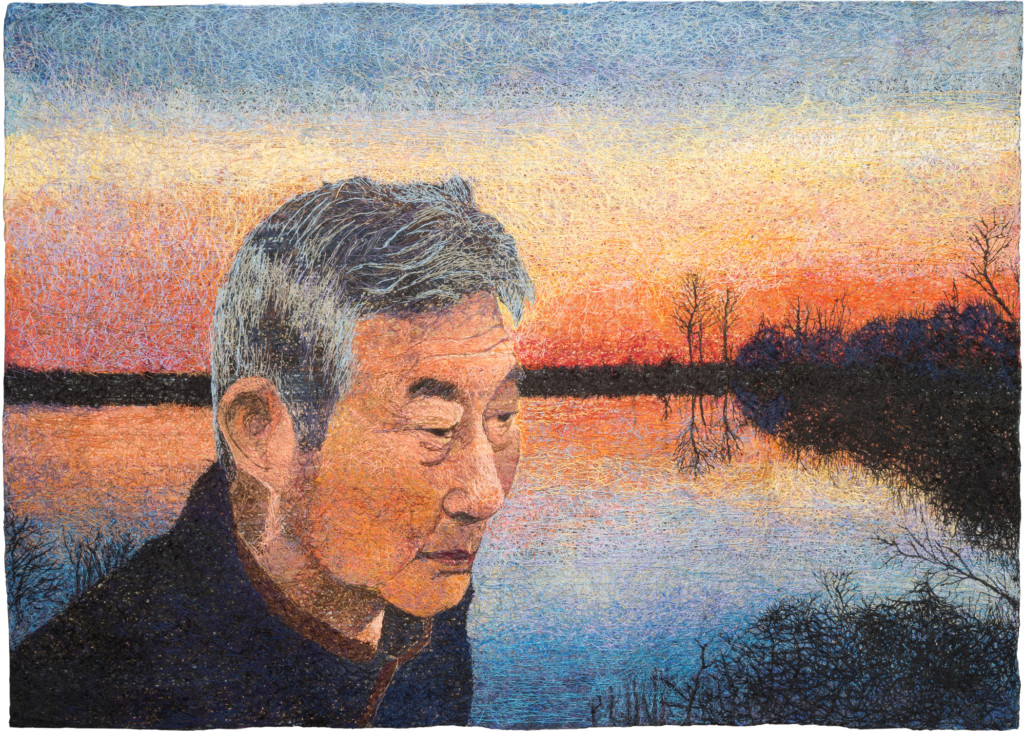 The quilt depicts my father who studied and taught 18th century English poetry. Like romantic poets, my father believed that a love of nature can lead to a love of mankind. In one of my visits to him before he passed away, I took a picture of my father when he was standing and staring at the beach after sunset. It shows the magnitude of nature's beauty in moments of stillness, reflecting my father's life as a hermit known for his humility, courteousness, and love for nature.