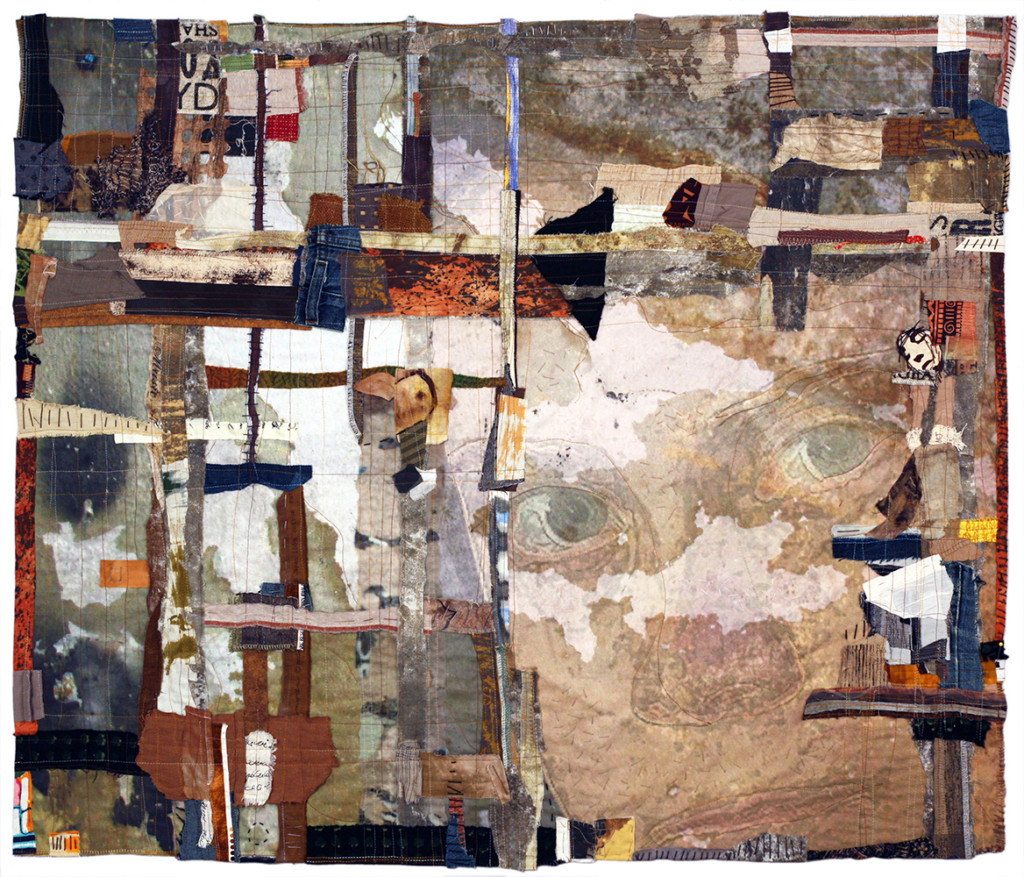 Digital photo transfer, repurposed clothing, scraps and remnants, pearl cotton thread