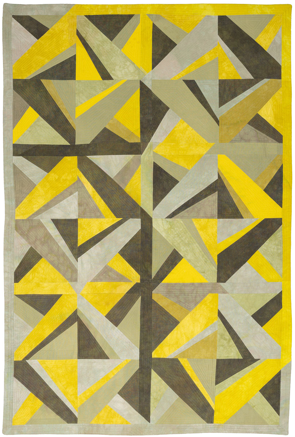 This sense of movement and transformation is also present in Lyrical by Nancy Cordy. In this piece Nancy used hand dyed and commercial cottons to “find lyricism, a rhythmic cadence in an image created by emphasizing the circular side of the shape and obscuring the hard straight side.” The language of curves and straight edges reflect her career as an architectural draftsperson; in her work she finds the intersection between the precision of drafting and the freedom of freehanding cutting. The overall effect is an exploration of “the colors’ and shapes’ relationships to each other and the whole”.