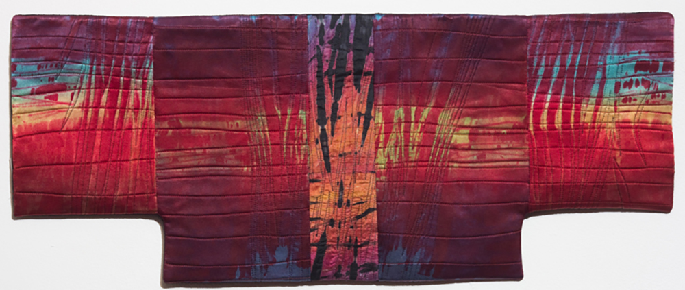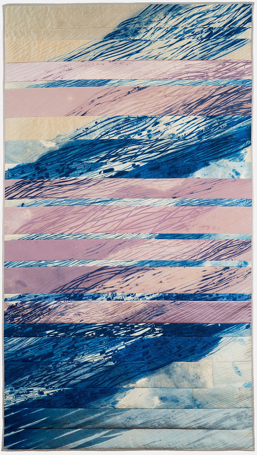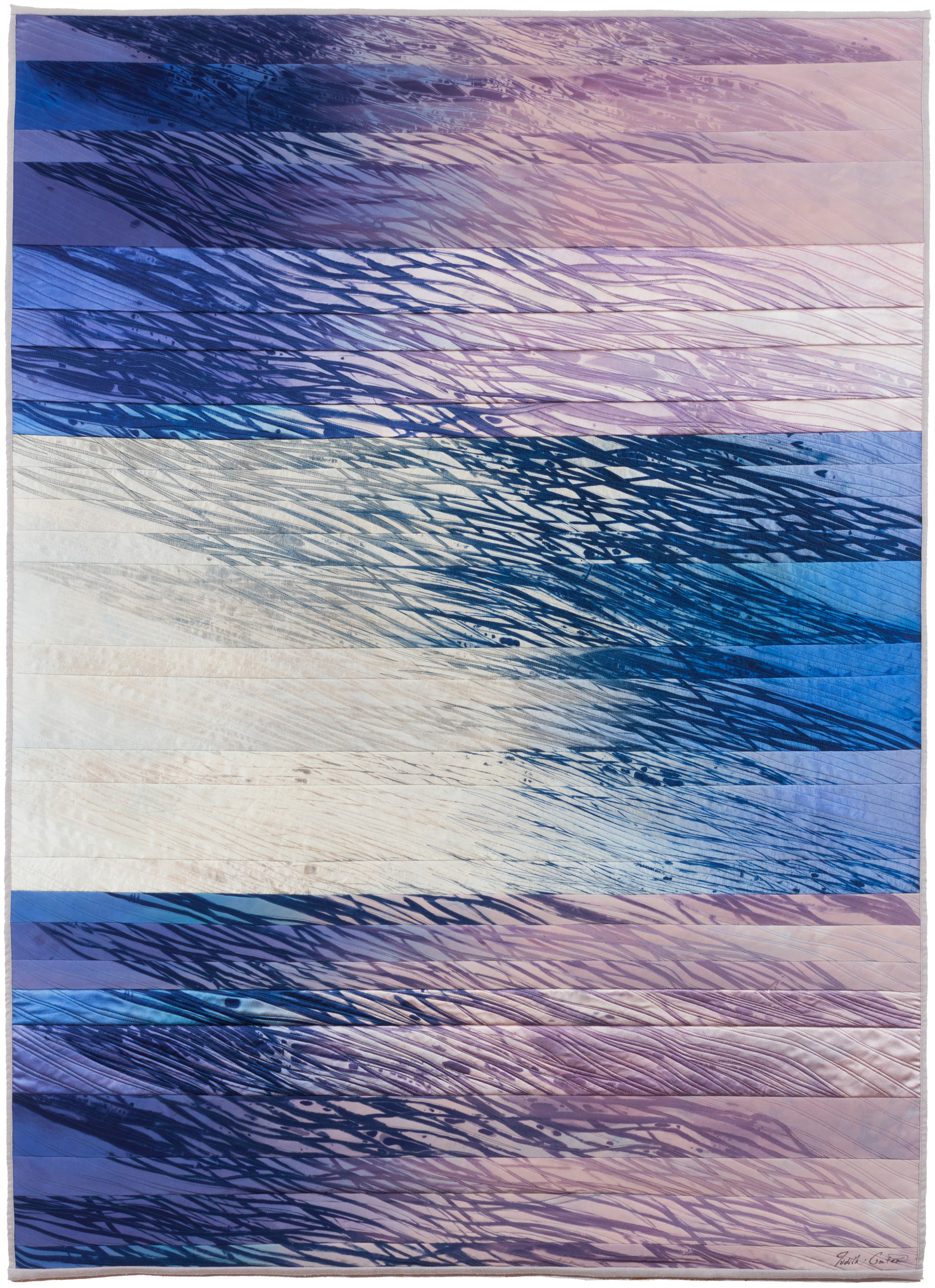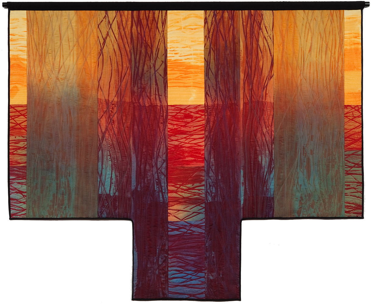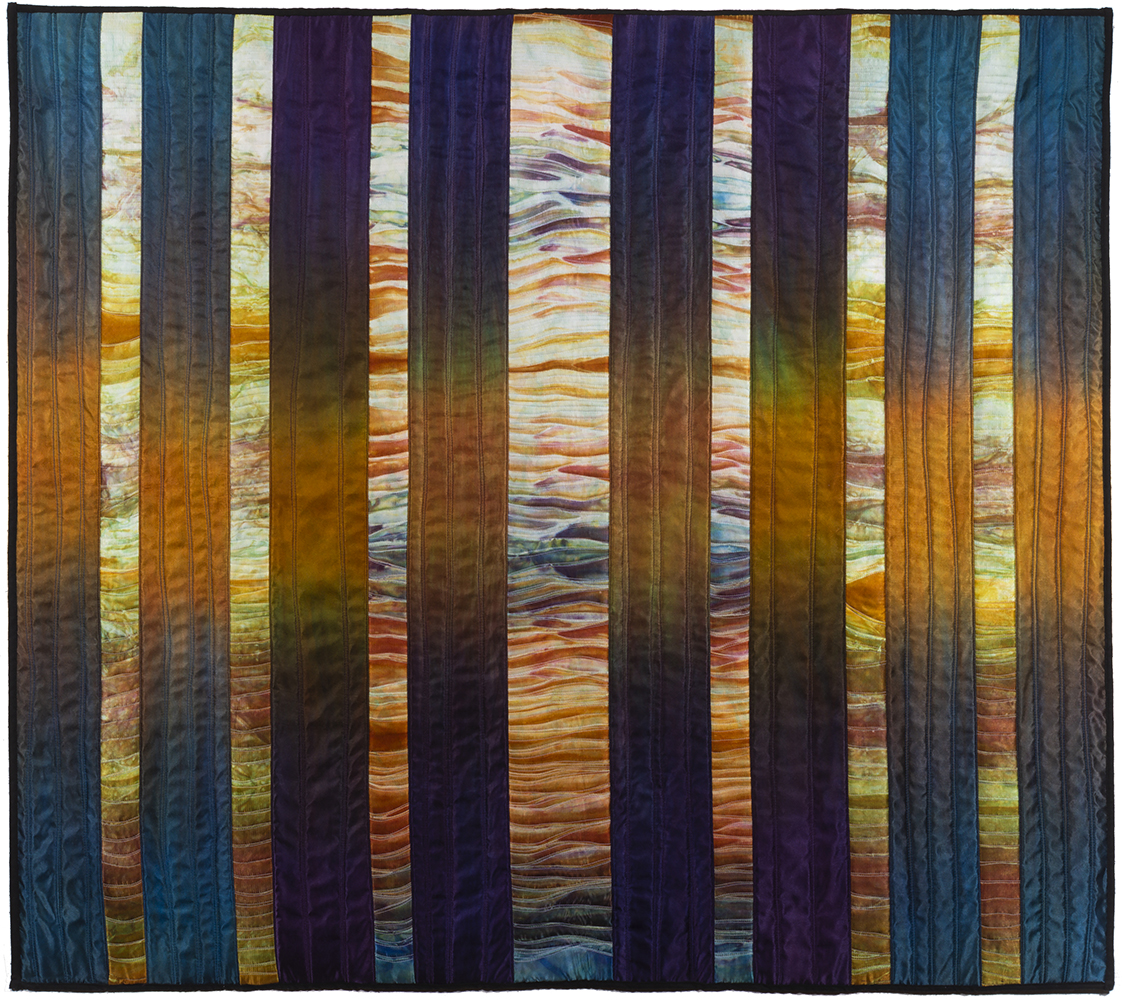 In keeping with this evocation of a force of nature, Judith’s hand-dyed, pieced and quilted silk wall pieces are inspired by the interplay of light and shadow on waterfalls, cliffs, canyon walls, coastal wetlands, and the desert. The theme of nature’s power and beauty is particularly evident in her works Squall Line and Passage and imbue other pieces as well, such as Meltwater and Aftermath, all on display in two of our galleries.