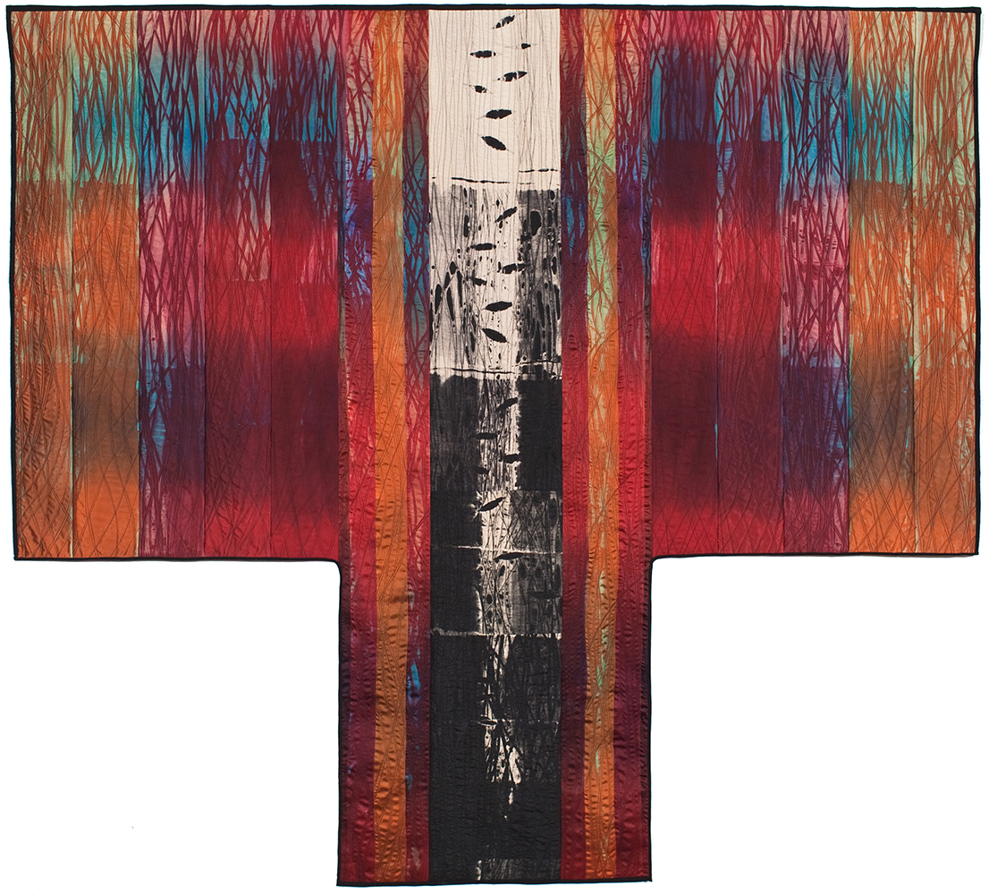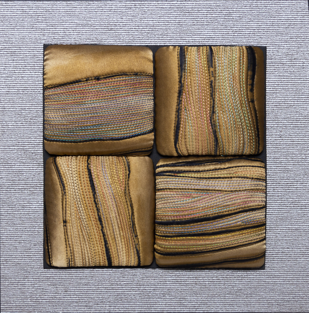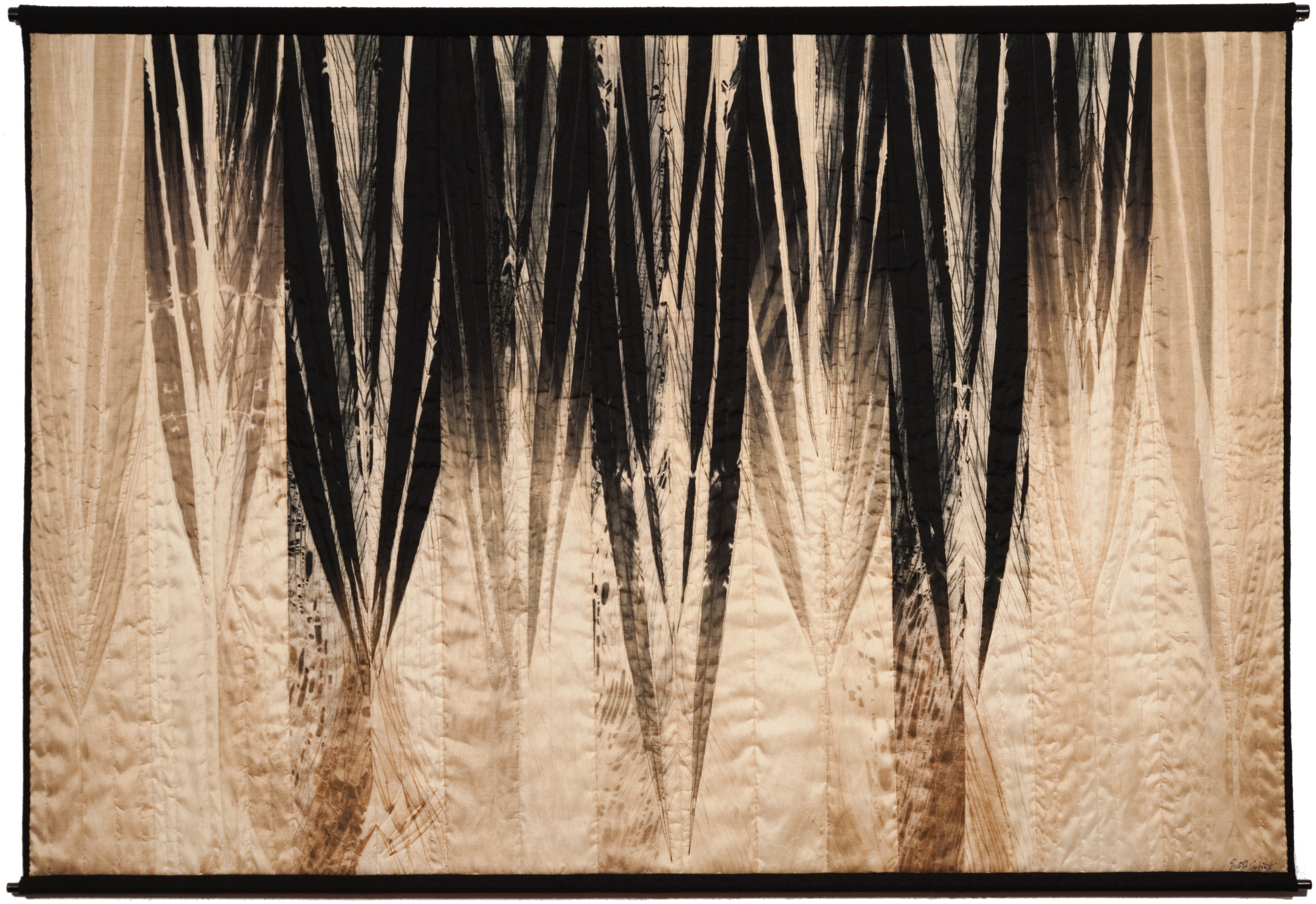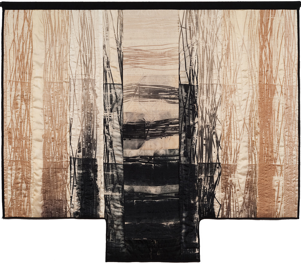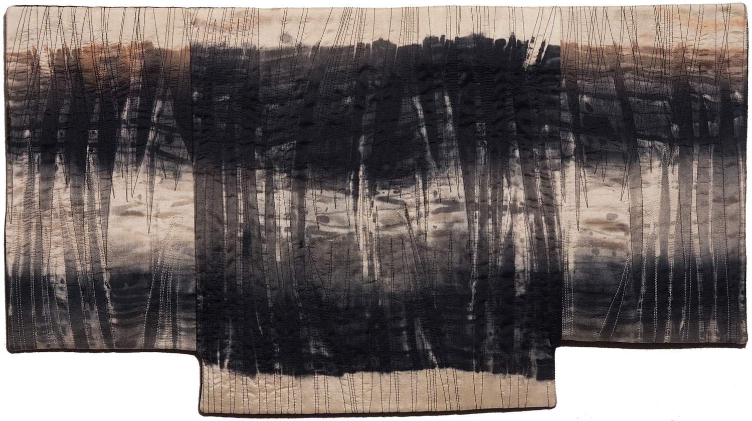 In keeping with this evocation of a force of nature, Judith’s hand-dyed, pieced and quilted silk wall pieces are inspired by the interplay of light and shadow on waterfalls, cliffs, canyon walls, coastal wetlands, and the desert. The theme of nature’s power and beauty is particularly evident in her works Squall Line and Passage and imbue other pieces as well, such as Meltwater and Aftermath, all on display in two of our galleries.