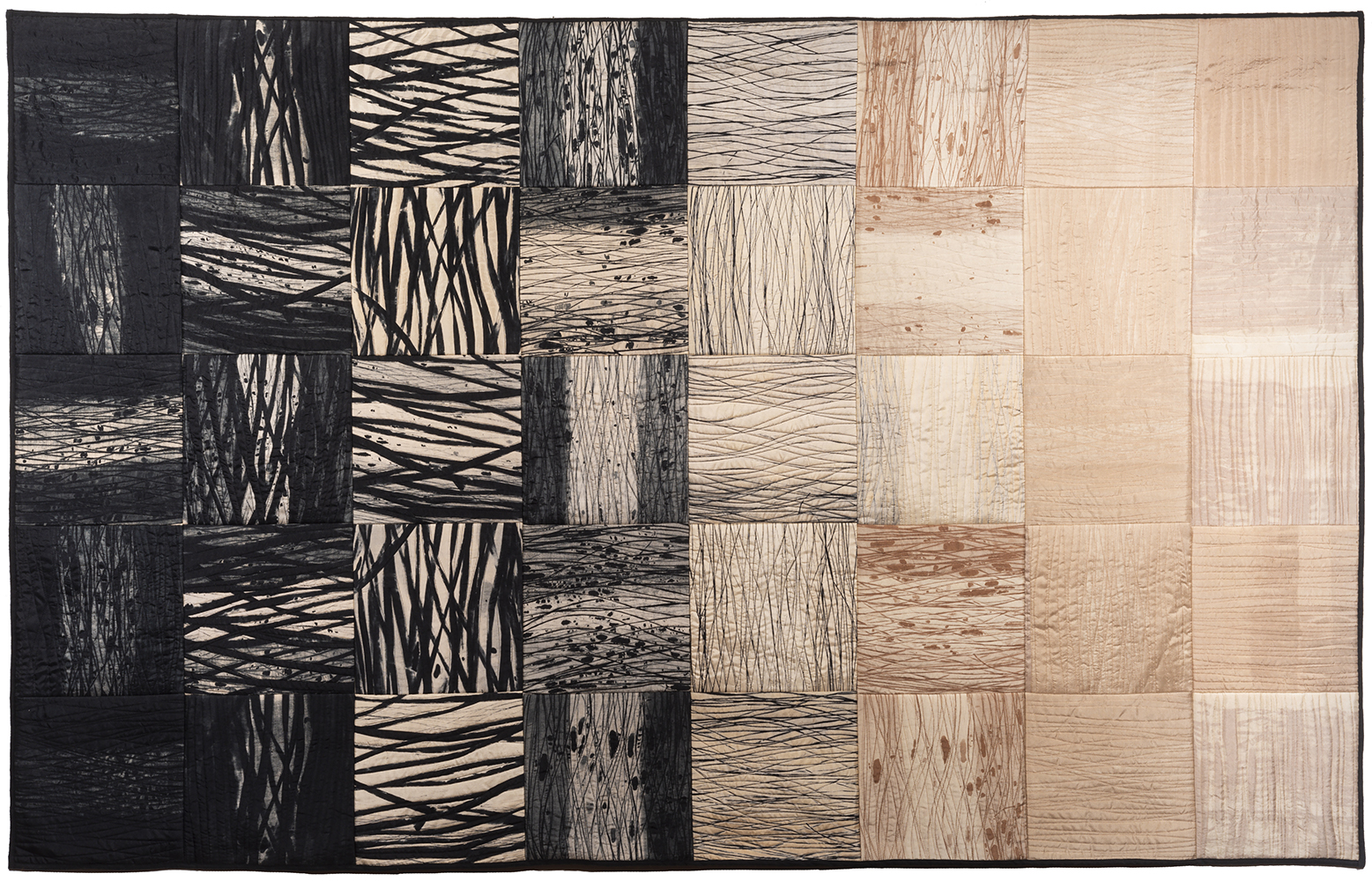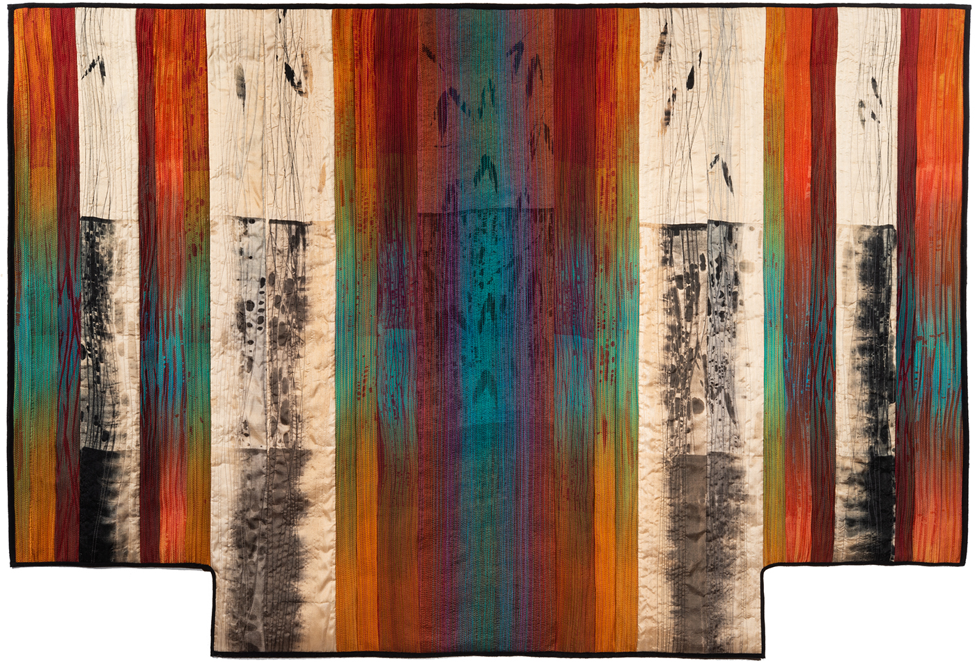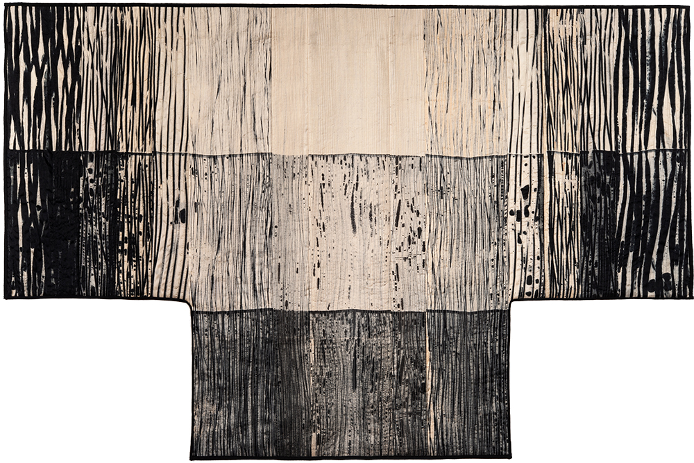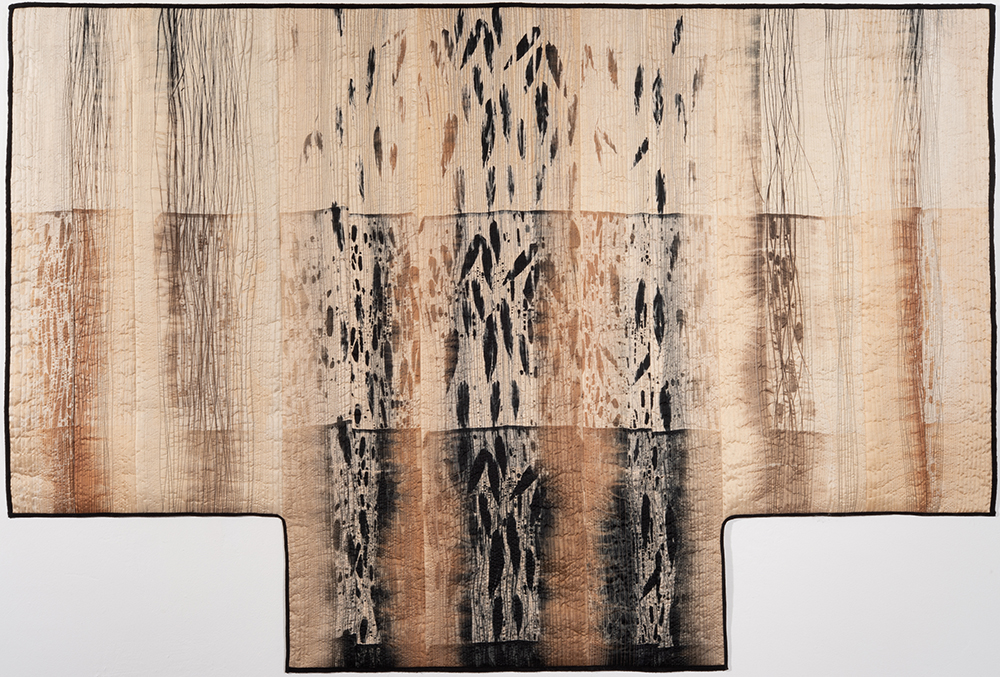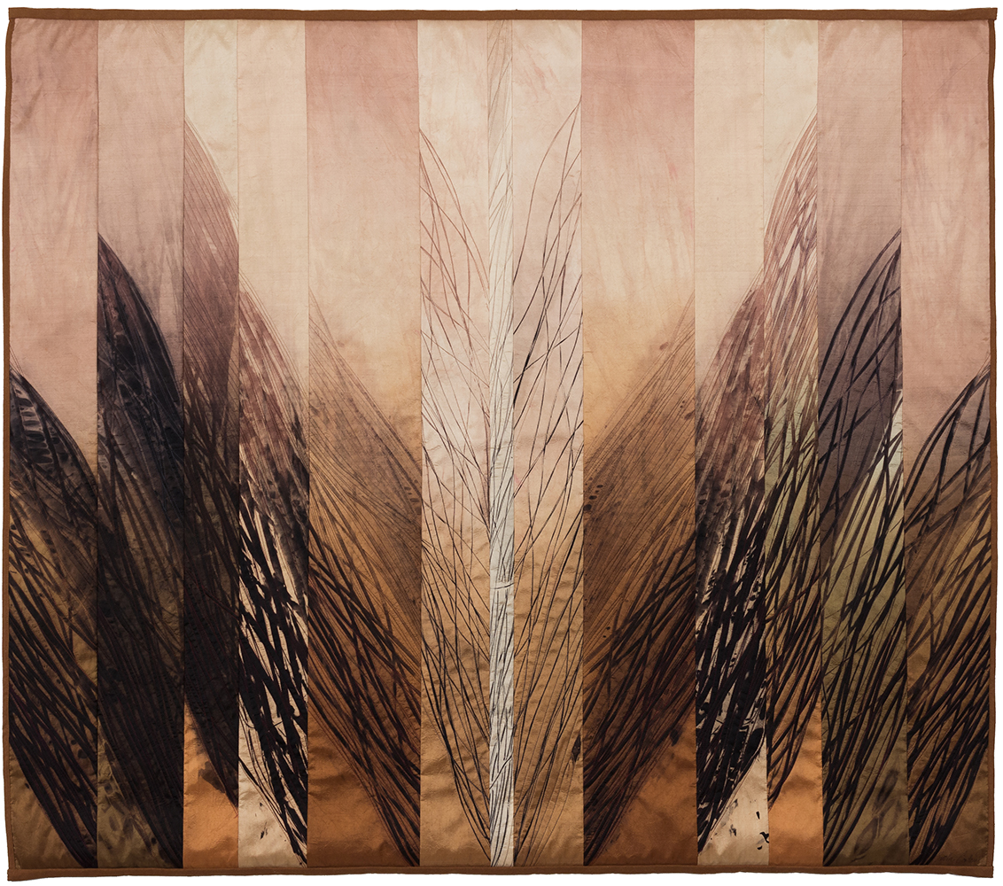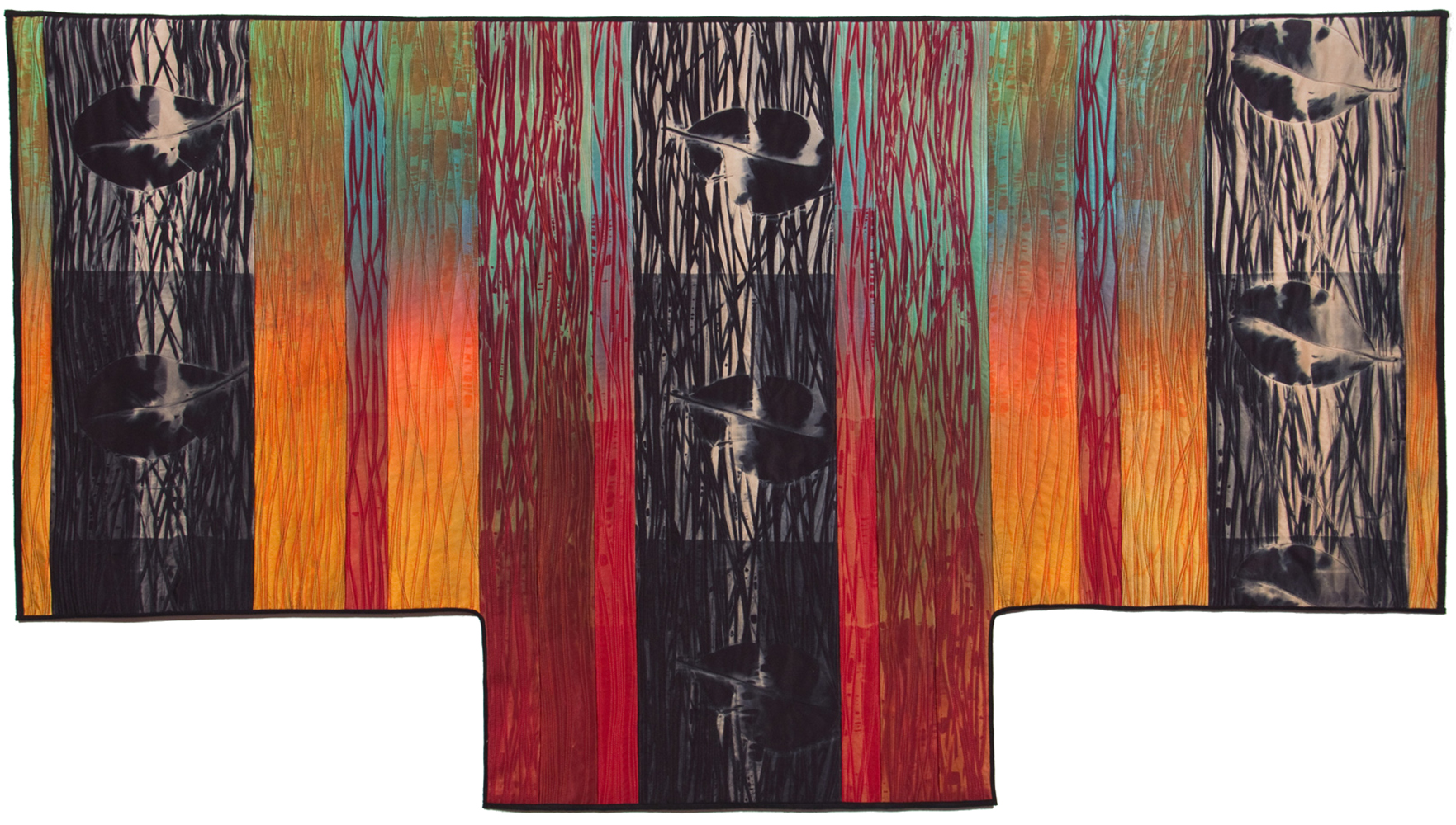 In keeping with this evocation of a force of nature, Judith’s hand-dyed, pieced and quilted silk wall pieces are inspired by the interplay of light and shadow on waterfalls, cliffs, canyon walls, coastal wetlands, and the desert. The theme of nature’s power and beauty is particularly evident in her works Squall Line and Passage and imbue other pieces as well, such as Meltwater and Aftermath, all on display in two of our galleries.