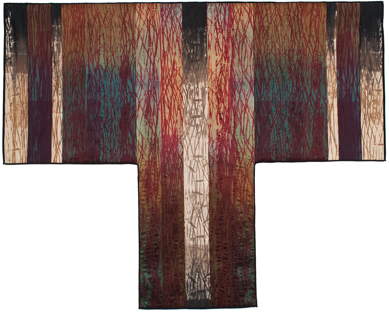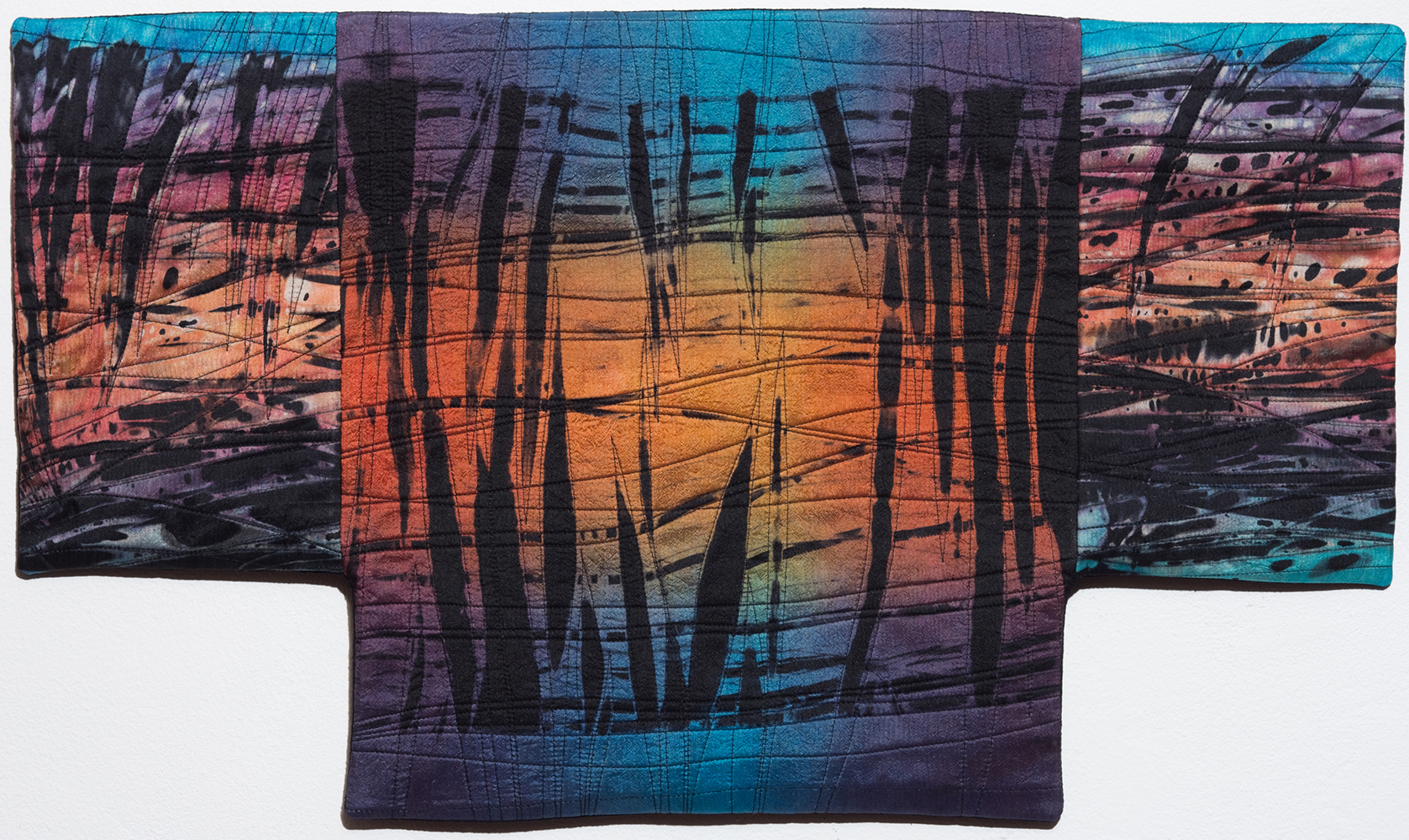 Much of Judith’s work is made from hand-dyed silks. In dyeing fabric, she adds and subtracts colors in layers and relishes in the sometimes unexpected results. As Judith explains, “although I can control the results to a great extent, the element of surprise when the designs are revealed never fails to excite me.” Throughout her process, she relies on intuition as well as experience. Rather than taking detailed notes on various process outcomes, she allows “each dye session to enlighten the next” and finds inspiration in diverse silks that are “strewn on the studio floor, torn up, arranged and rearranged until they resonate.” When the composition is ready, she meticulously secures fragments to the design wall and, after further study and refining, she sews, quilts, and sometimes appliqués to accentuate depth or movement in the piece.