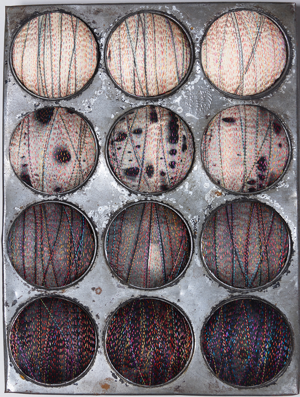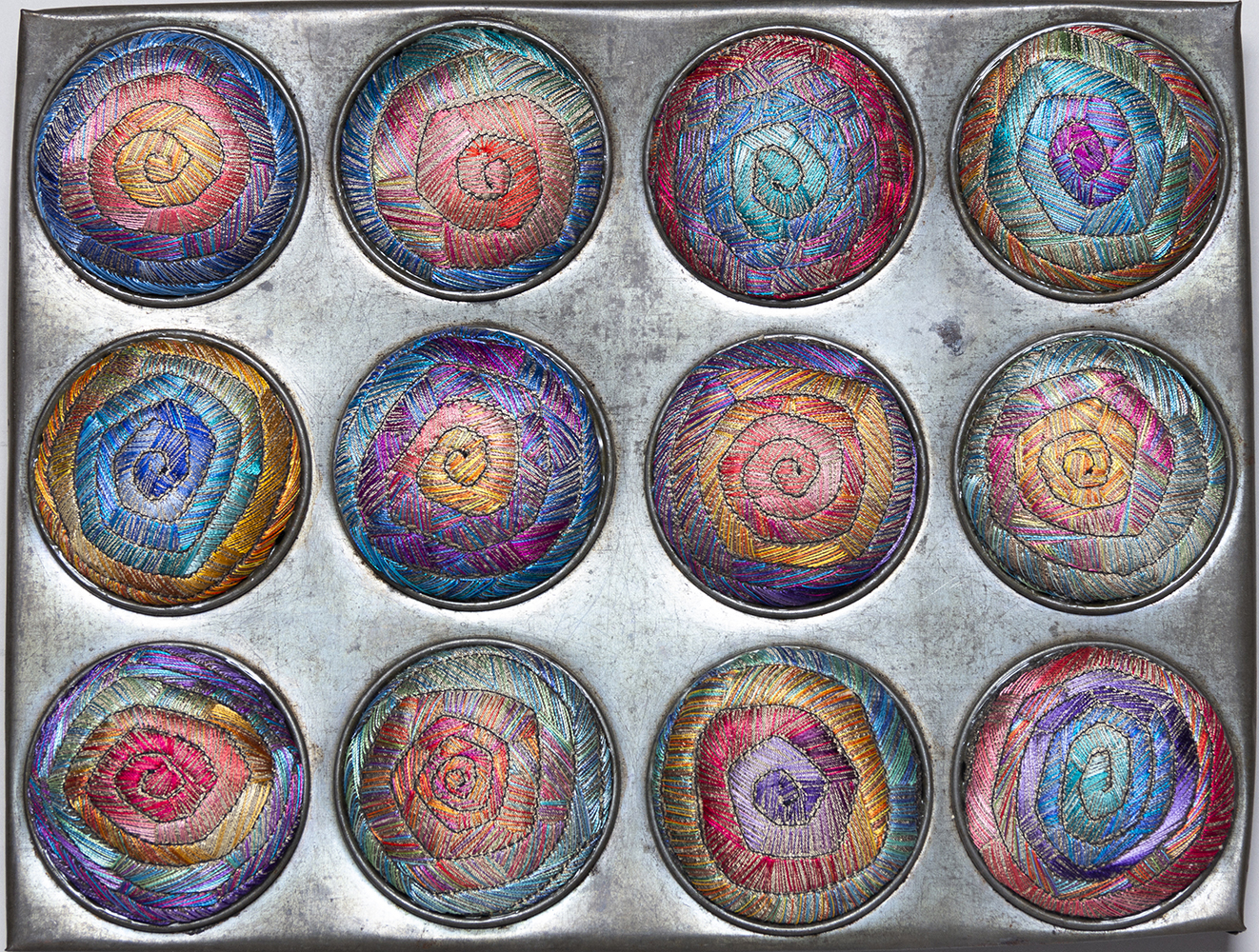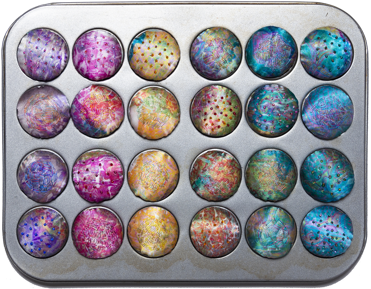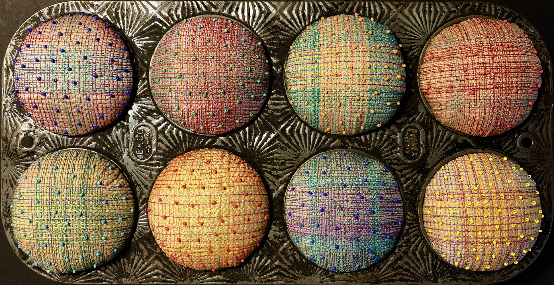In addition to working with 2-dimensional quilts, Judith enthusiastically explores other creative tributaries including jewelry design, painting buttons, and crocheting nests such as Dragonfly. Other sculptural fabric confections, such as El Dulce, are also on display in this exhibition.