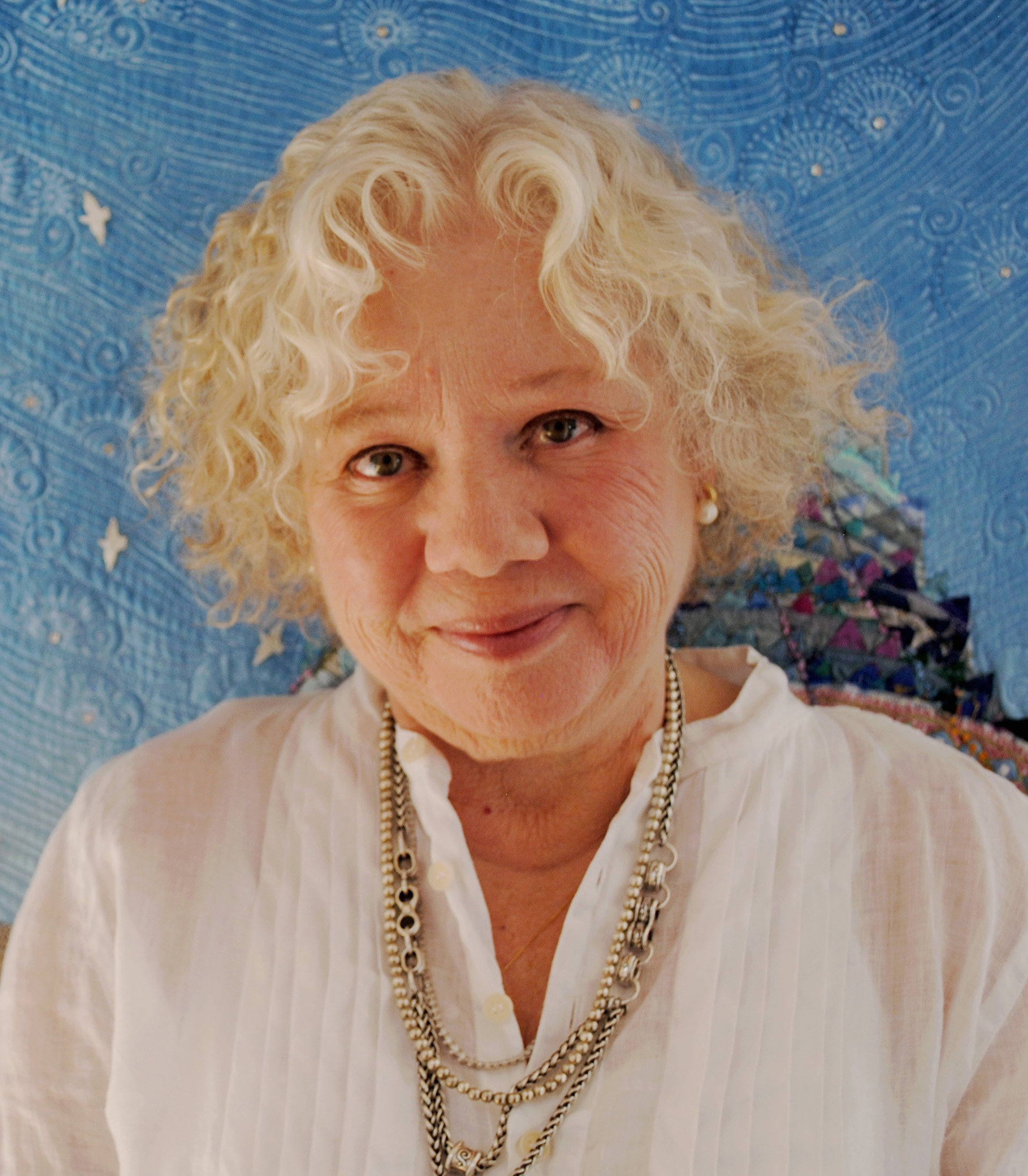 In the immersive installation Of Meadows and Blue Skies, Melody envelopes us in a natural landscape of her own artistic imagination. A meadow, she observes, is a place to catch one’s breath. With these art quilts, she surrounds us with big skies and tall grasses that offer us a place to stretch and embrace the quiet. She treats us to “the music of the wind in the grasses, the changing cloudscape, the way the light shines on the dandelion puffs in the early morning.” The overall effect is “a feeling of limitless time” outside of the hustle-bustle of the everyday.