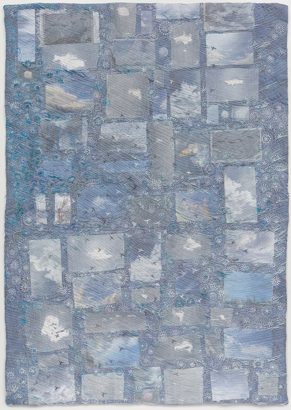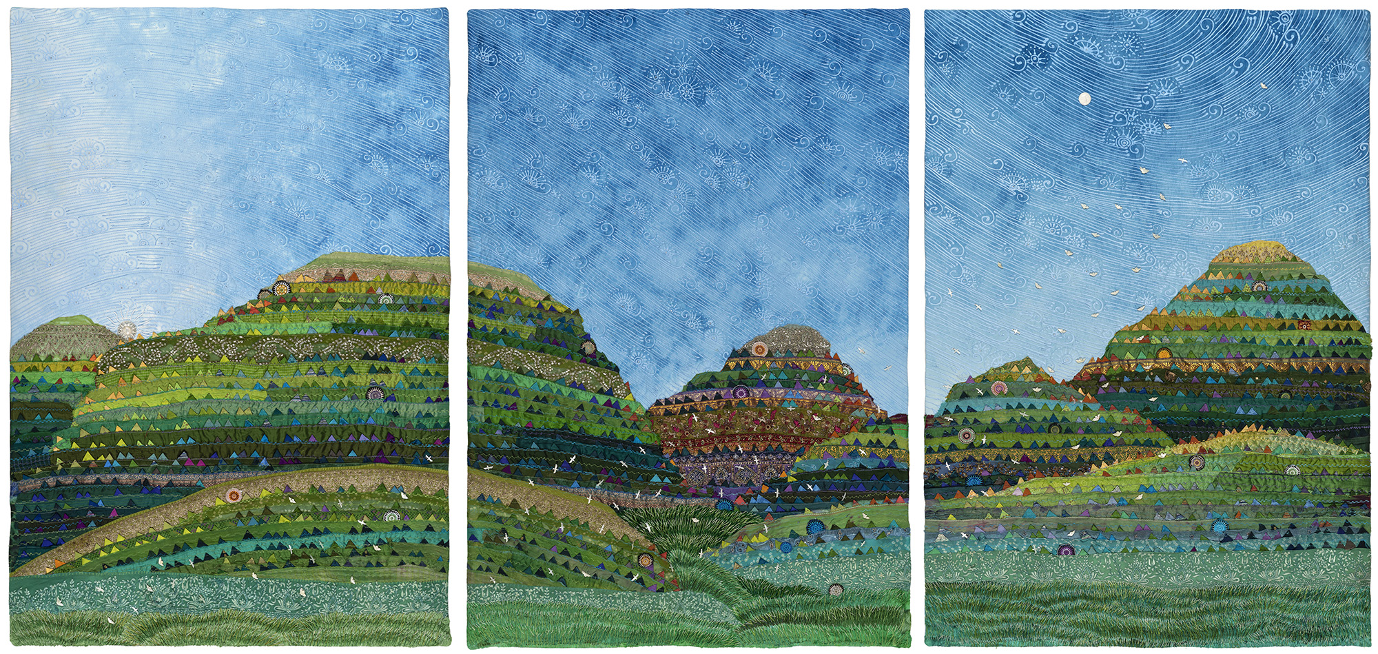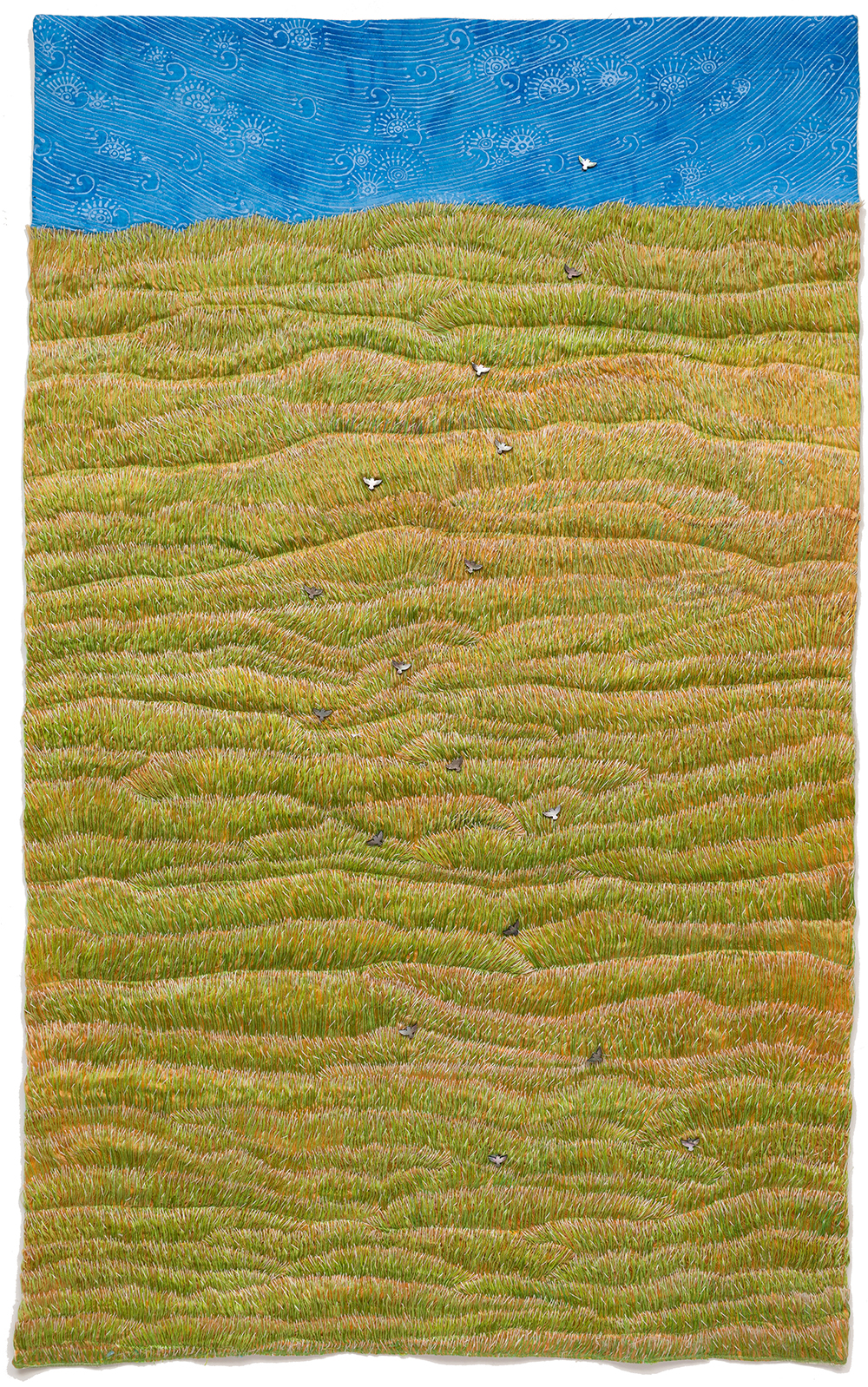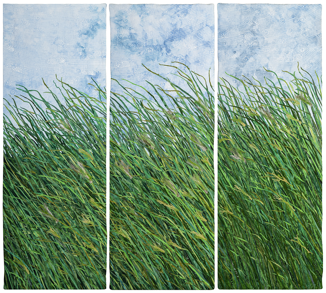 In the immersive installation Of Meadows and Blue Skies, Melody envelopes us in a natural landscape of her own artistic imagination. A meadow, she observes, is a place to catch one’s breath. With these art quilts, she surrounds us with big skies and tall grasses that offer us a place to stretch and embrace the quiet. She treats us to “the music of the wind in the grasses, the changing cloudscape, the way the light shines on the dandelion puffs in the early morning.” The overall effect is “a feeling of limitless time” outside of the hustle-bustle of the everyday.