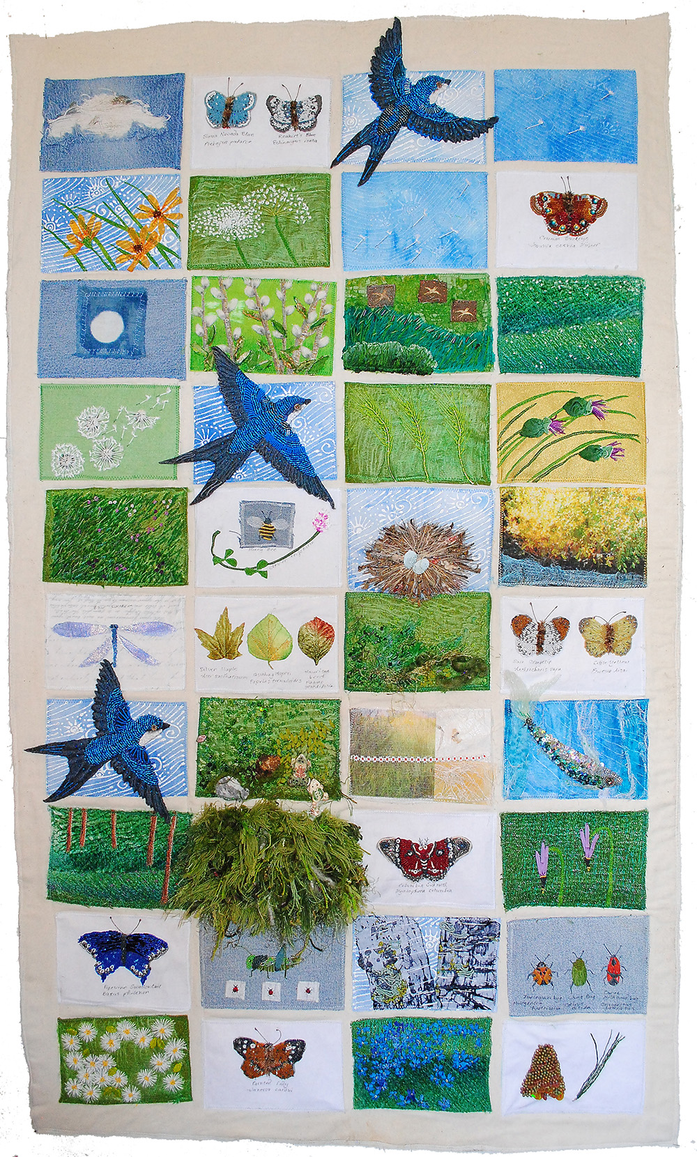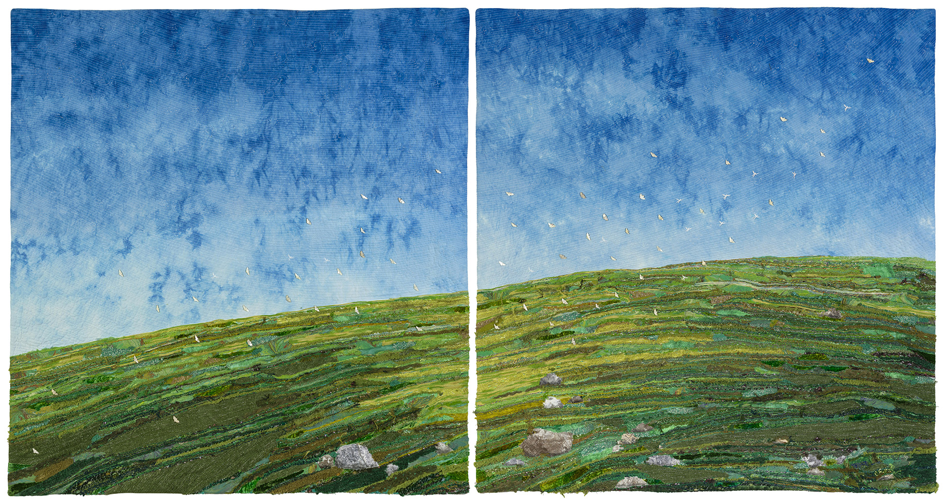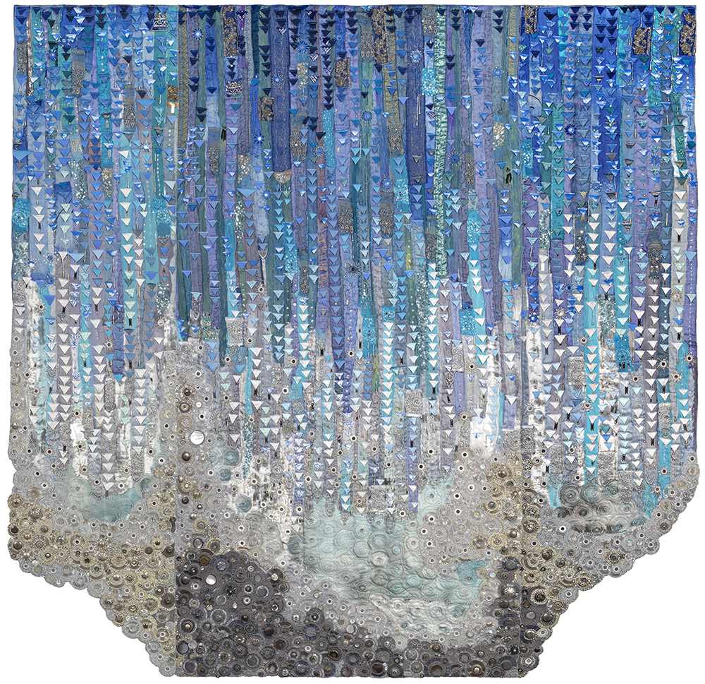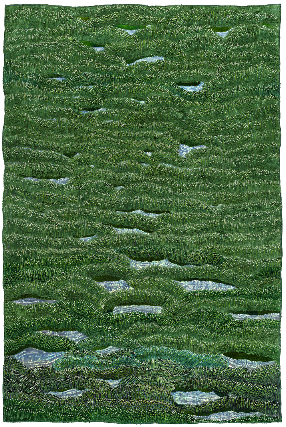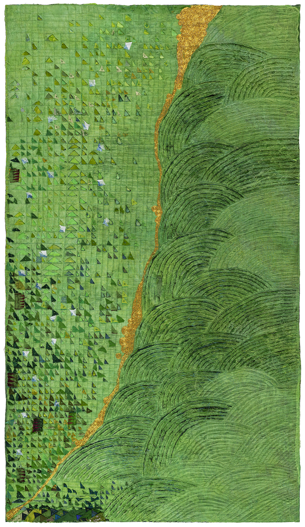 In the immersive installation Of Meadows and Blue Skies, Melody envelopes us in a natural landscape of her own artistic imagination. A meadow, she observes, is a place to catch one’s breath. With these art quilts, she surrounds us with big skies and tall grasses that offer us a place to stretch and embrace the quiet. She treats us to “the music of the wind in the grasses, the changing cloudscape, the way the light shines on the dandelion puffs in the early morning.” The overall effect is “a feeling of limitless time” outside of the hustle-bustle of the everyday.
