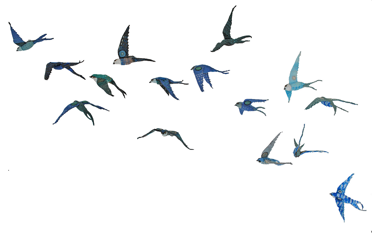 For Melody, a meadow both “amazes” the senses and provides a quiet sanctuary where we can find restoration and renewal. In The Moment In Between, Melody echoes kintsugi, the traditional Japanese method of using gold to repair broken pottery. As Melody explains, this method “is a way of honoring the break and becoming stronger with the repair.” Her “river of gold” and “white triangles” of birds flying above invite us into the meadow’s power of contemplation.