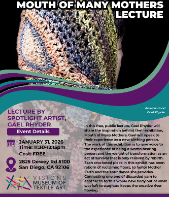 In this free, public lecture, Gael Rhyder will share the inspiration behind their exhibition, Mouth of Many Mothers. Gael will speak to their experience as a new birthing person. The work of this exhibition is to give voice to the experience of being a womb bearing person and the weight of transformation as an act of survival that is only relieved by rebirth. Each crocheted piece in this exhibit has been reborn of reclaimed fibers, to honor Mother Earth and the abundance she provides. Connecting one end of discarded yarn to another to form a whole new body out of what was left to stagnate keeps the creative river flowing.