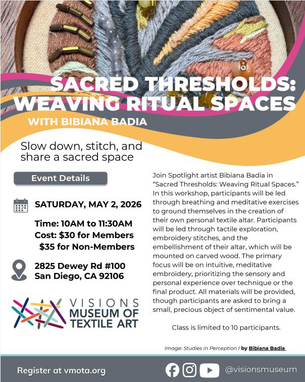 Join Spotlight artist Bibiana Badia in “Sacred Thresholds: Weaving Ritual Spaces.” In this workshop, participants will be led through breathing and meditative exercises to ground themselves in the creation of their own personal textile altar. Participants will be led through tactile exploration, embroidery stitches, and the embellishment of their altar, which will be mounted on carved wood. The primary focus will be on intuitive, meditative embroidery, prioritizing the sensory and personal experience over technique or the final product. All materials will be provided, though participants are asked to bring a small, precious object of sentimental value.