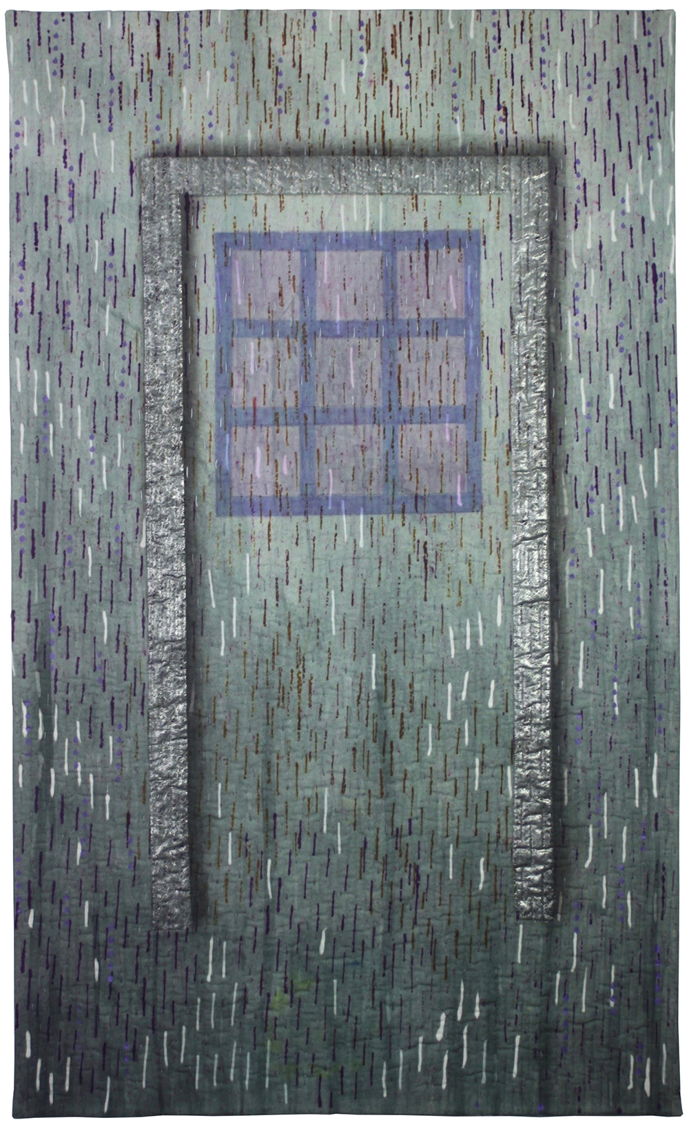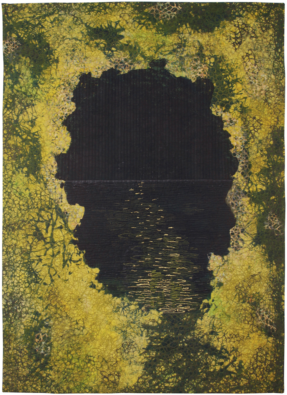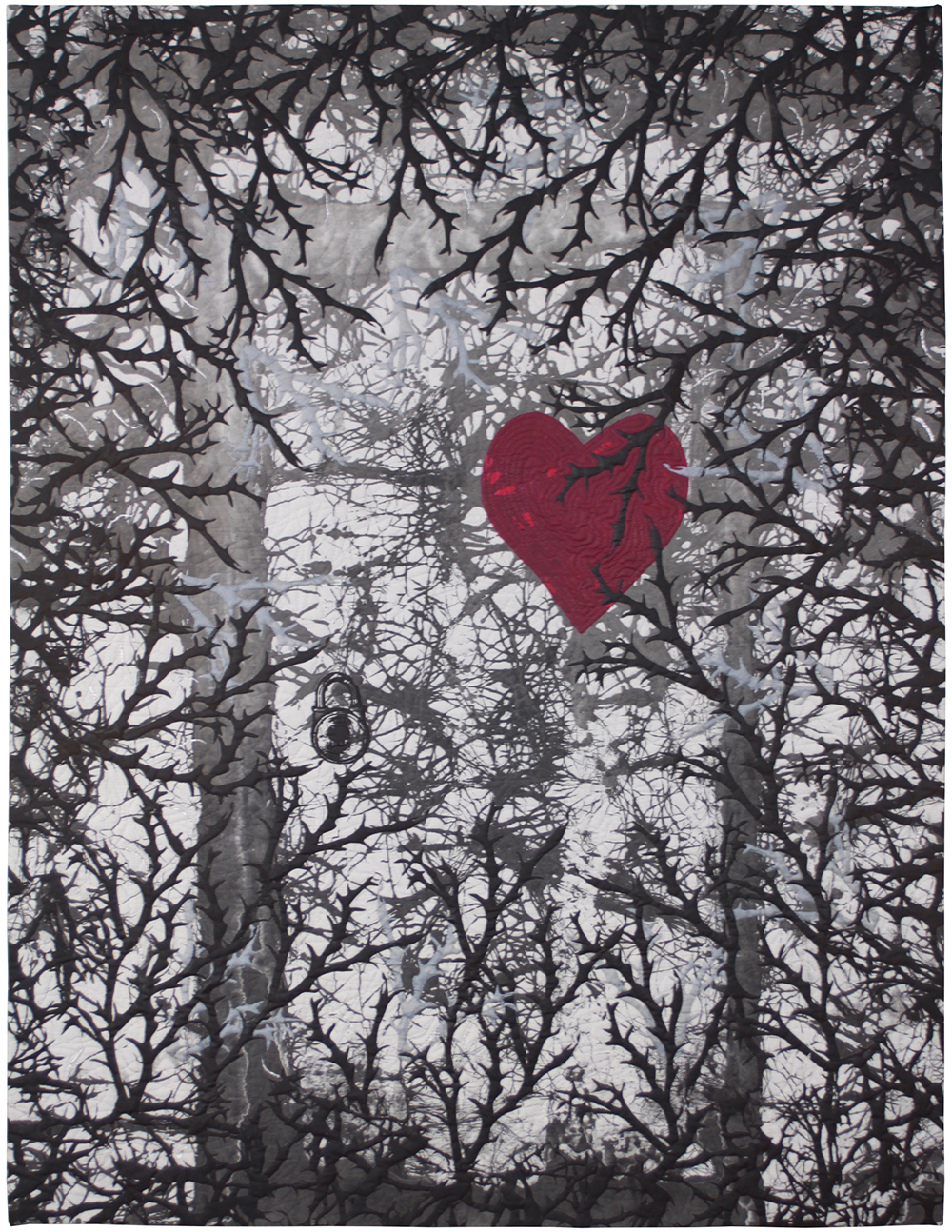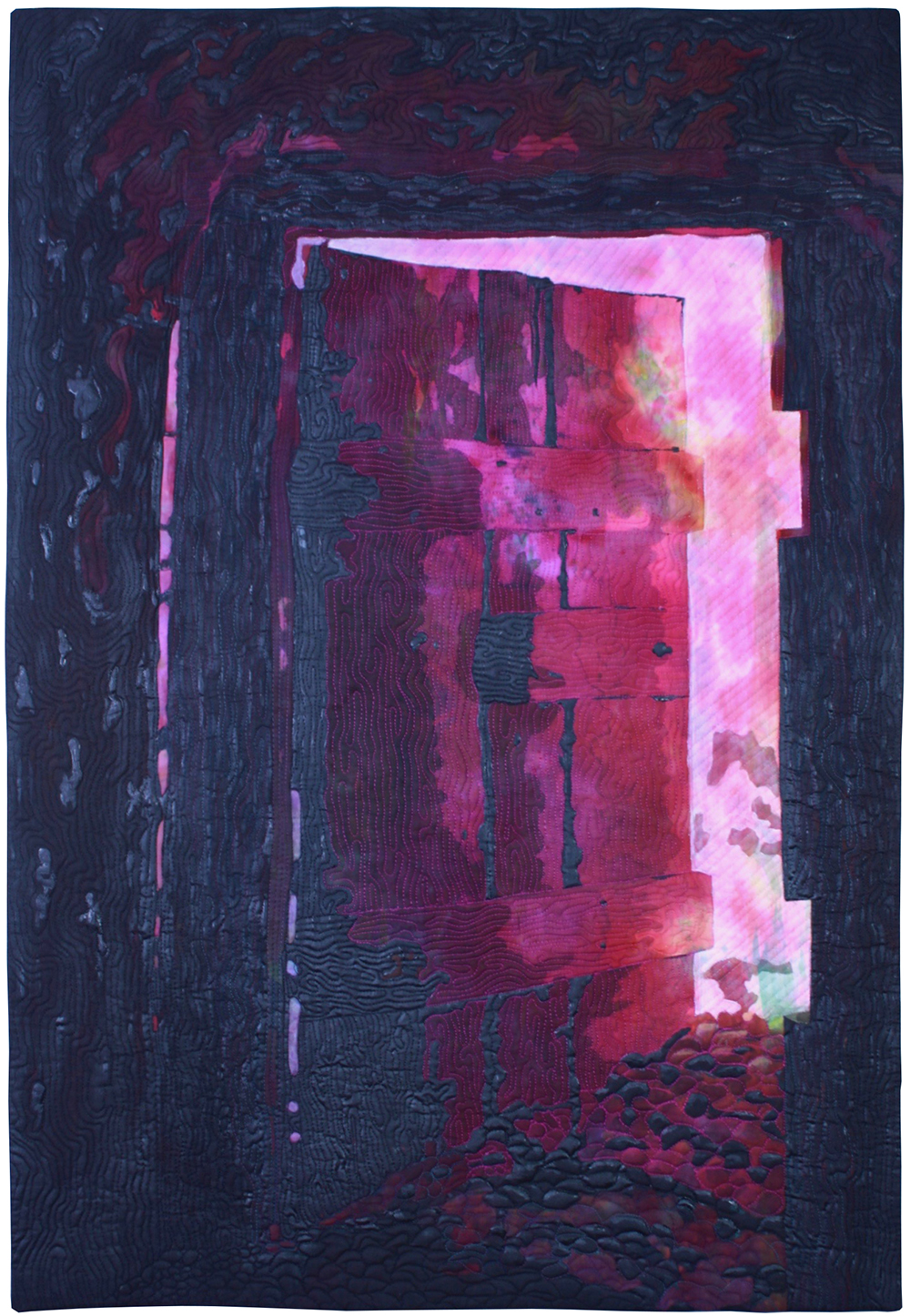 In Open This Door, Waddle uses doors as portals through which we examine our life’s struggles and choices. The colors of the doors, well outside our ordinary experience, invite us into worlds of our own imagination. A closed door with no visible handle, perhaps awaiting the slightest nudge. It looks solid and heavy, but perhaps it responds to the breath of a whisper. Two quilts from a series of 6 depict the same door in varying degrees of abstraction, offering an examination of doors opened, and those unopened, during life’s journey. An abstract portal launches us into the sea. And is the heart sheltered by the trees? Or pierced by limbs?